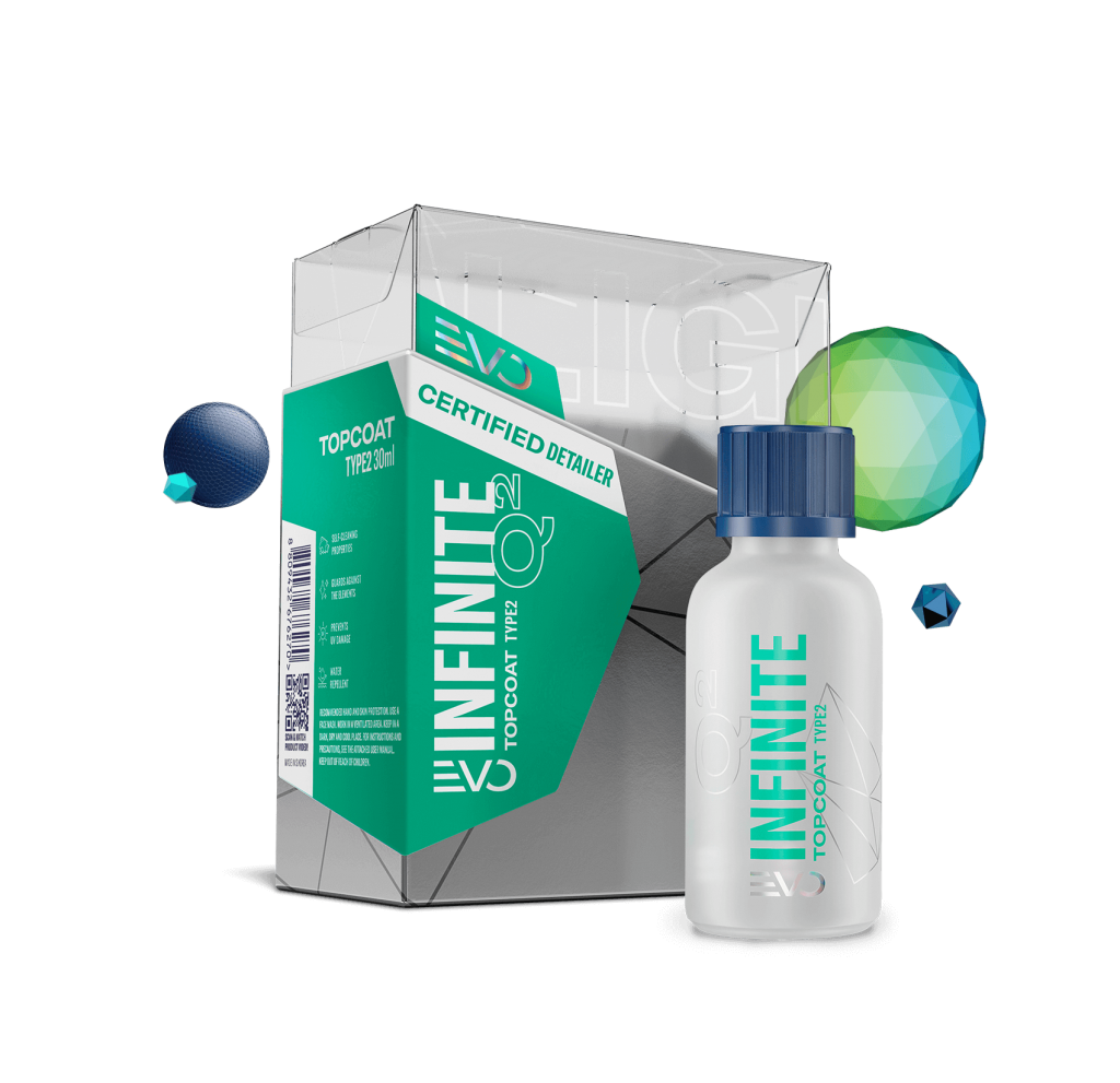 The prime goal of Q² Infinite TopCoat Type 2 compare to Type 1 is to enhance the surface slickness and durability of the hydrophobic effect on any Base coat. It is recommended to use this top coat on vehicles in mild climates or on vehicles following proper maintenance.